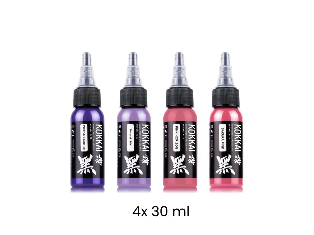 Soft Tension kombiniert vier Pastell- bis kräftige Lila-Rosatöne. Diese Farbskala ist ideal für PMU, Blumenmotive, Fantasy-Designs oder Tattoos mit leichtem, „softem“ Look.