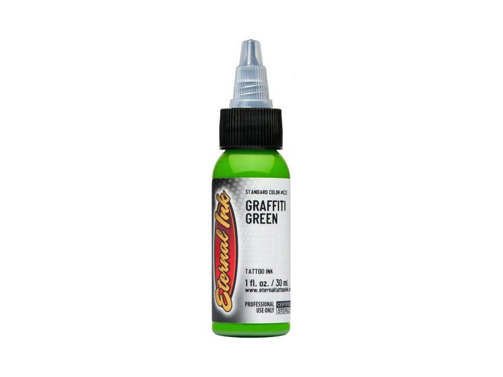 Eternal Ink 33 Graffiti Green ist ein heller und leuchtender Grünton aus der Eternal Ink Trainingsserie, der zum Üben von Tätowiertechniken, Farbübergängen und realistischen Effekten ohne Anwendung auf lebendiger Haut entwickelt wurde. Die Tinte hat eine hohe Sättigung, einen gleichmäßigen Verlauf und eine ausgezeichnete Konsistenz, so dass sie das Verhalten professioneller Tätowierpigmente nachahmt.