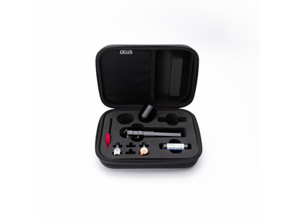 Zum Lieferumfang gehören die Maschine selbst, ein 33-mm-Griff, ein 40-mm-Griff plus, drei austauschbare Hublängen (3,7 mm Standard, 4,1 mm Heavy, 4,5 mm Super Heavy), zwei Batterien, ein USB-C-Ladegerät, eine Tragetasche, ein Inbusschlüssel, Silikonfett, eine Bedienungsanleitung, ein Aufkleber und ein Magnet.