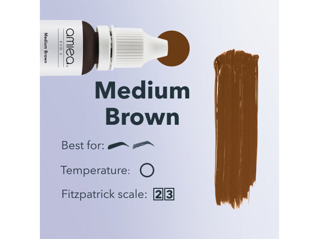Amiea - Medium Brown ist ein Pigment mit einer neutralen Farbtemperatur, was es vielseitig und für alle Hauttypen verwendbar macht. Durch den gelben Unterton eignet sich die mittelbraune Farbe für Kundinnen mit brünetten Brauen.