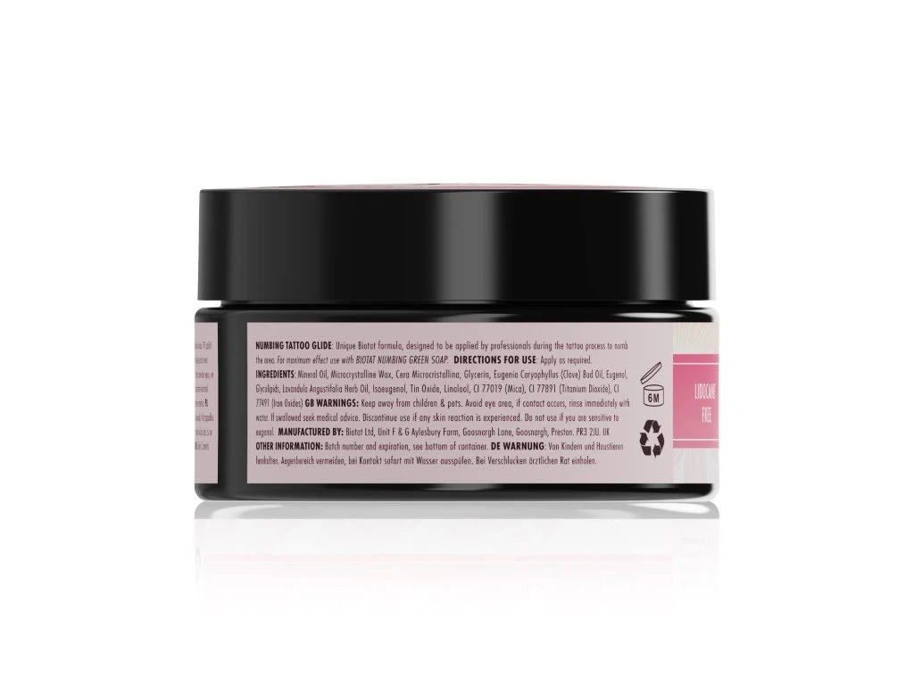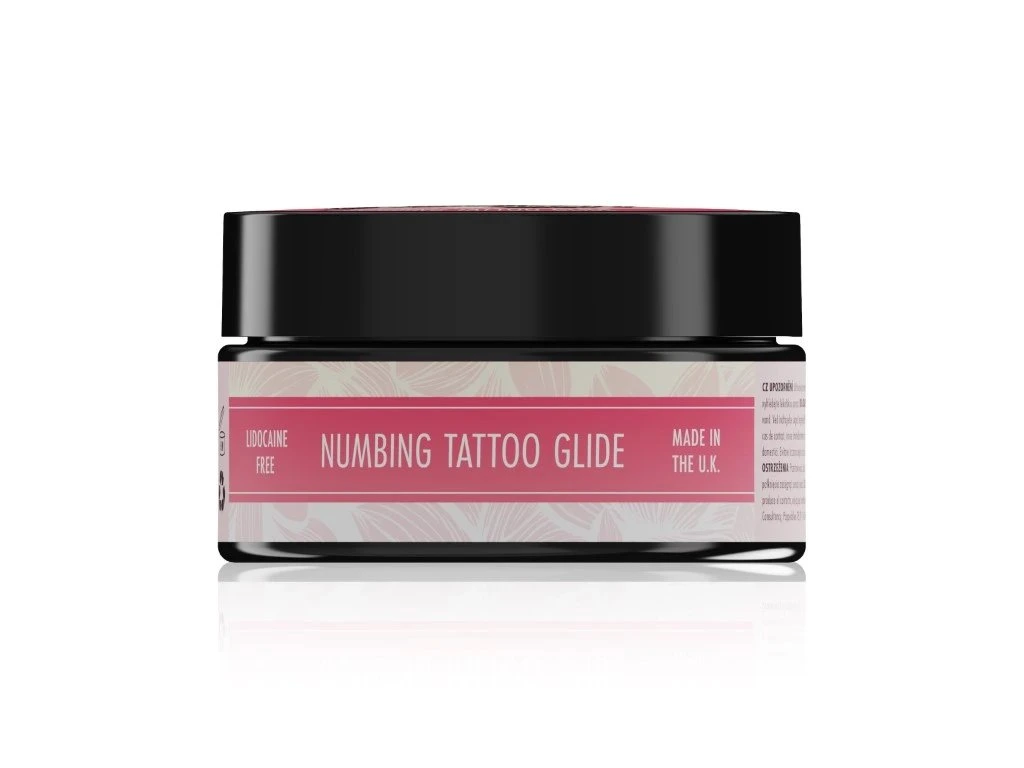 Vaseline mit einem Hauch von natürlichem Rosa. Verwenden Sie sie wie jede andere Vaseline oder verarbeitete Butter, mit dem zusätzlichen Vorteil, dass sie die Haut betäubt und Schwellungen und Rötungen deutlich reduziert. Im Gegensatz zu Produkten auf Lidocainbasis lässt sie die Haut nicht anschwellen, was das Tätowieren erschwert. Ihr Kunde wird sich die ganze Zeit wohlfühlen. Die Vaseline gleitet super geschmeidig und verstopft weder die Nadeln noch verwischt sie die Tätowierung. Unsere Künstler lieben die transparente Gleitcreme, die es ermöglicht, mit Schwarz, Grau und helleren Farben präziser zu arbeiten.