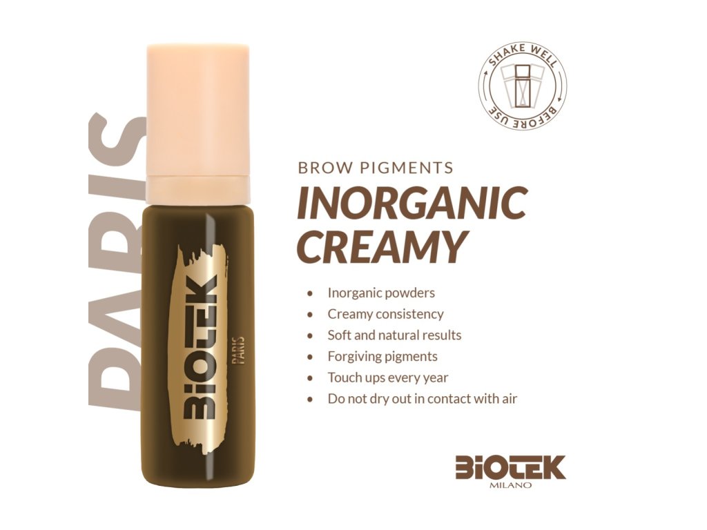 Die Inorganic Creamy Eyebrow-Serie wurde mit dem klaren Ziel entwickelt, maximale Kontrolle während der Anwendung zu gewährleisten. Die cremige und konzentrierte Textur ermöglicht eine gleichmäßige Pigmentierung, reduziert das Risiko von Überpigmentierung und fördert eine stabile Heilung. Dank der reinen Mineralzusammensetzung bleibt das Ergebnis bis zu einem Jahr lang weich und natürlich.