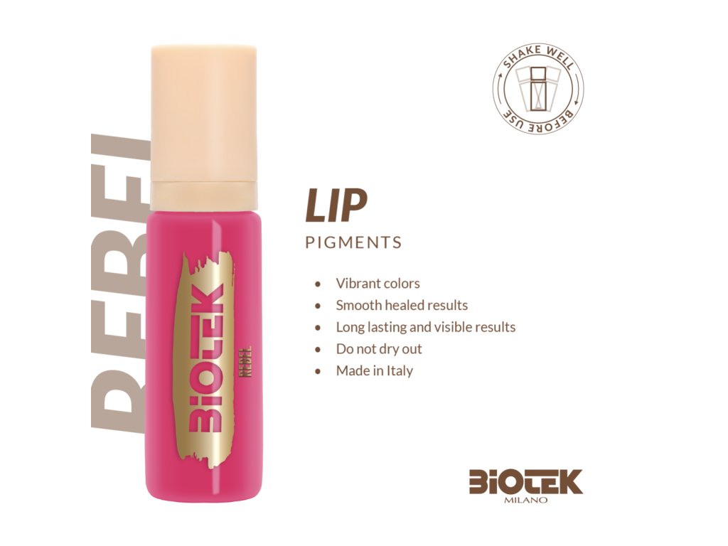 Das Pigment Biotek Rebel wurde speziell für die Anwendung auf den Lippen im Rahmen von Permanent Make-up und Microblading entwickelt. Der Farbton besticht durch sein intensives Fuchsia-Lila und eignet sich ideal für Kundinnen, die einen ausdrucksstärkeren Effekt wünschen. Die vegane, tierversuchsfreie und in Italien hergestellte Formel sorgt für optimale Deckkraft und ein langanhaltendes Farbergebnis. Das Produkt ist in einer Airless-Flasche verpackt, die eine maximale Nutzung des Inhalts und minimalen Abfall gewährleistet.