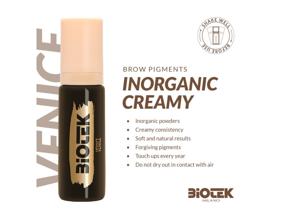 Venice ist als Spitzenprodukt der Inorganic Creamy Eyebrow-Reihe konzipiert. Es richtet sich an Kundinnen mit sehr dunklen bis fast schwarzen Augenbrauen, bei denen herkömmliche Dunkelbrauntöne mit der Zeit an Deckkraft verlieren oder ins Graue übergehen. Die neutrale Basis dieses Pigments wurde optimiert, um eine intensive Farbsättigung und Tiefe ohne unerwünschte Kühle zu erzielen. Die cremige und hochkonzentrierte Textur ermöglicht eine präzise Anwendung und ein gleichmäßiges Einbringen des Pigments in die Haut. Die rein anorganische Mineralformel unterstützt eine stabile Heilung und sorgt für ein natürliches, aber intensives Ergebnis, das bis zu einem Jahr lang optisch konstant bleibt.