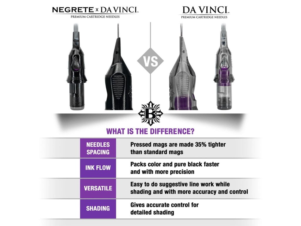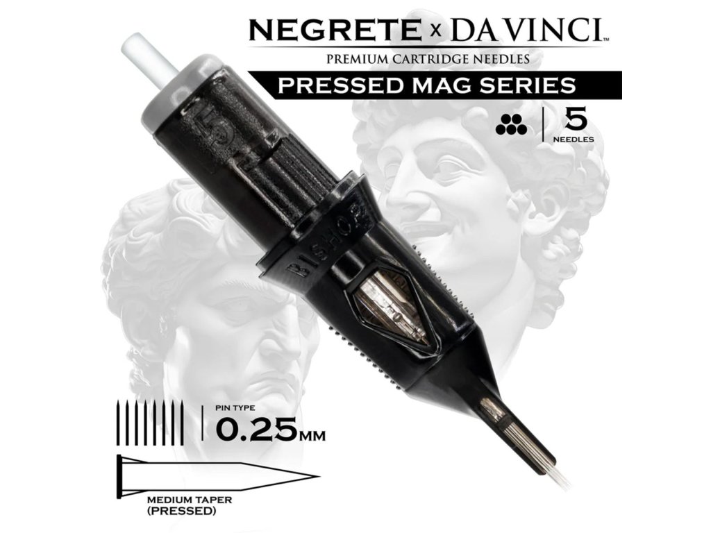 Die Bishop DaVinci x Freddy Negrete Pressed Magnum Cartridges revolutionieren die Arbeit mit Magnum-Nadeln. Die Nadeln sind „pressed“ (enger zusammengedrückt), was ein schnelleres Füllen von Schwarz- und Grautönen sowie sanfteres Schattieren und präzisere Arbeit in engen Bereichen ermöglicht.