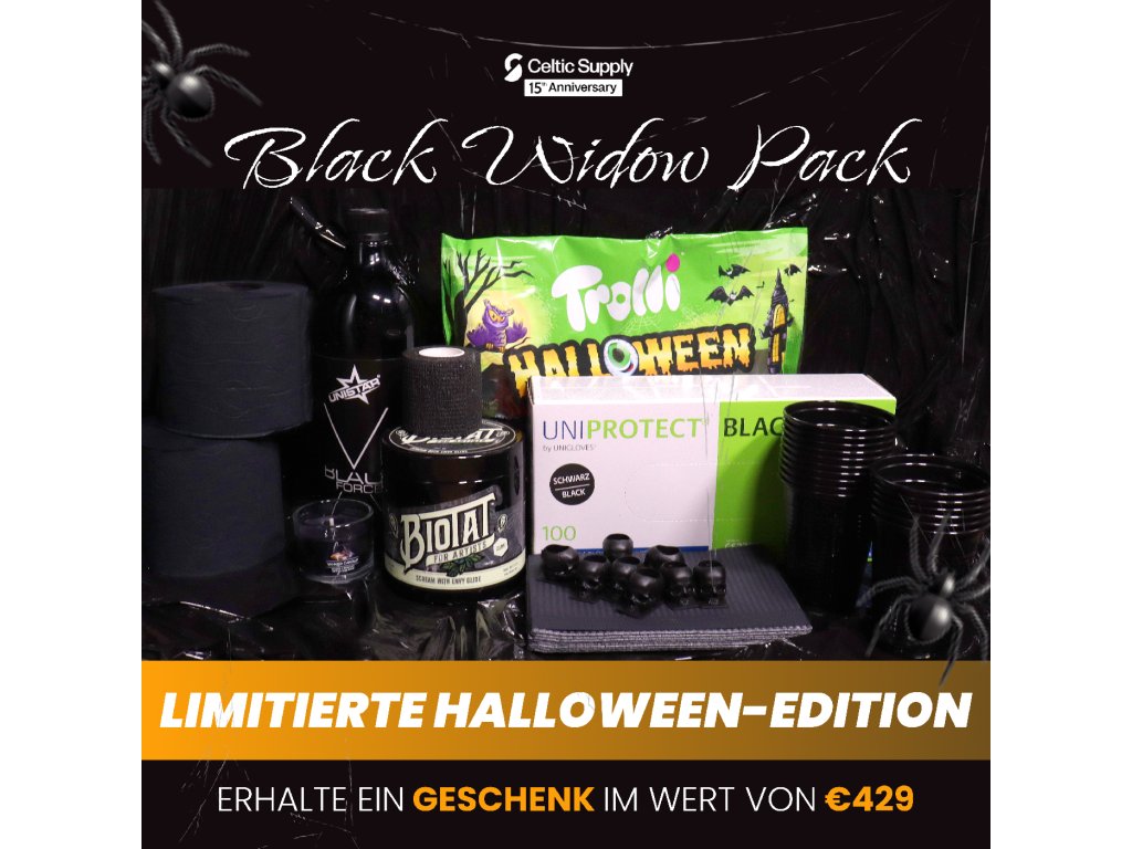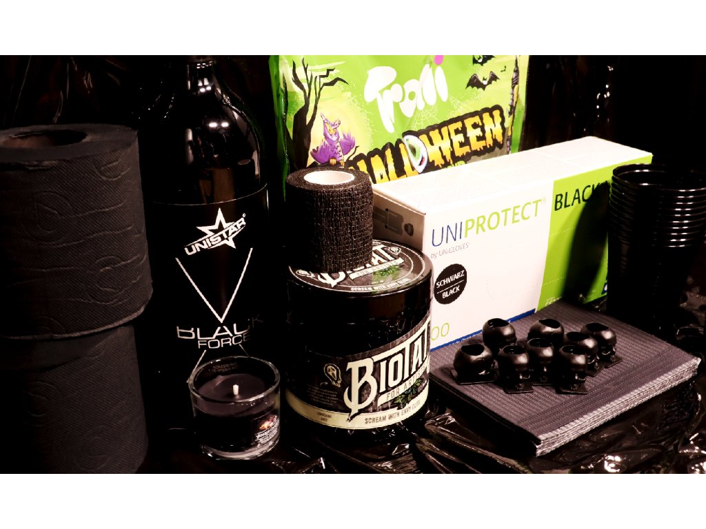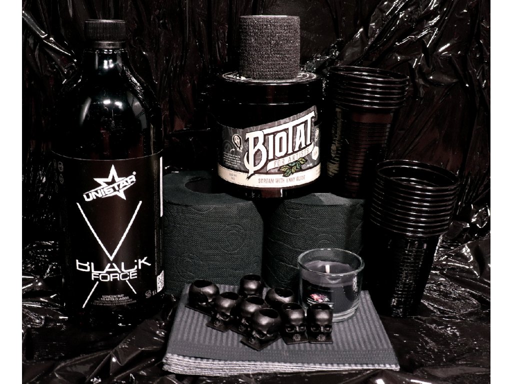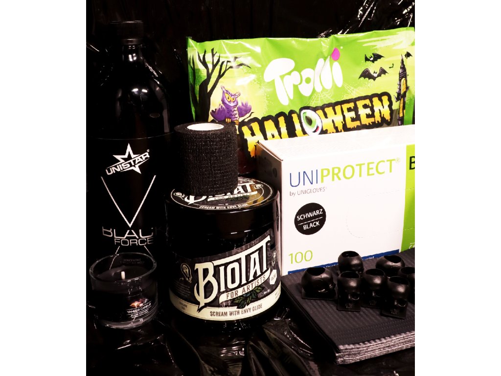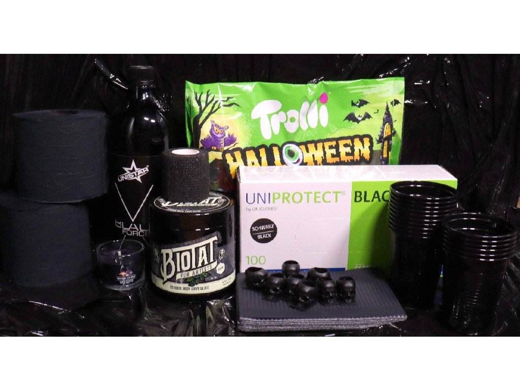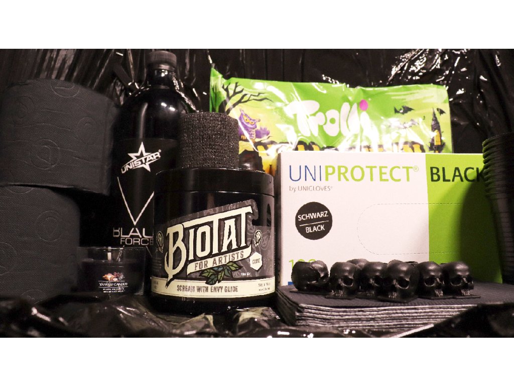 Das Black Widow Pack ist für Studios gedacht, die auf einheitliches, elegantes Equipment setzen. Es enthält schwarze Uniprotect-Handschuhe, schwarze Unterlagen und ein Schutzband für den Griff. Für das passende Halloween-Flair sorgen Saferly Cups in 3D-Schädelform und die schwarze Unistar Tattoo-Seife. Die Yankee Candle Black Coconut verleiht dem Raum einen angenehmen Duft, dazu gibt es süße Leckereien von Trolli. Alles schwarz – alles stimmig.