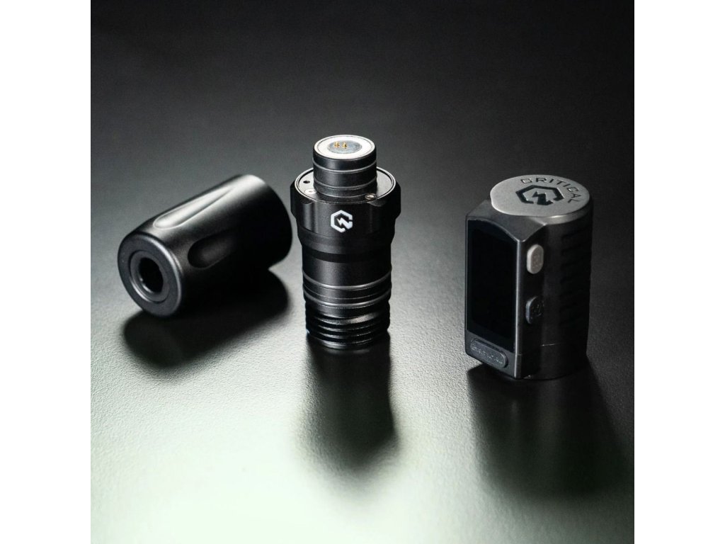 Součástí balení je bezdrátová baterie CRITICAL V3 o kapacitě 2000 mAh, která umožňuje provoz až 15 hodin v závislosti na nastaveném napětí a konfiguraci jehly. Ergonomický hliníkový grip 34 mm zajišťuje pevný úchop a komfort při delších projektech.