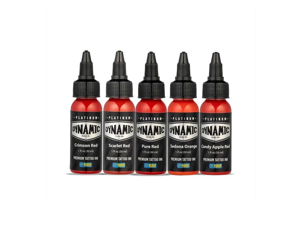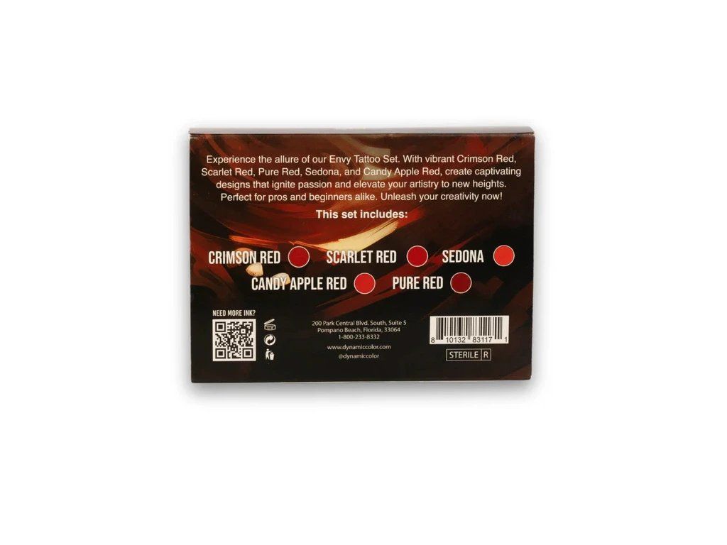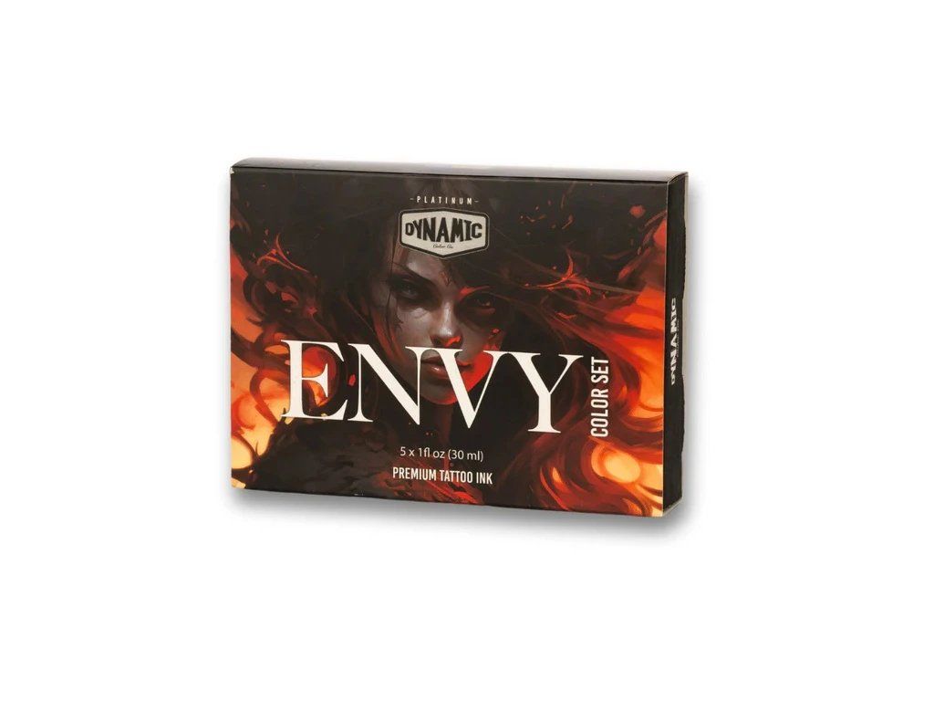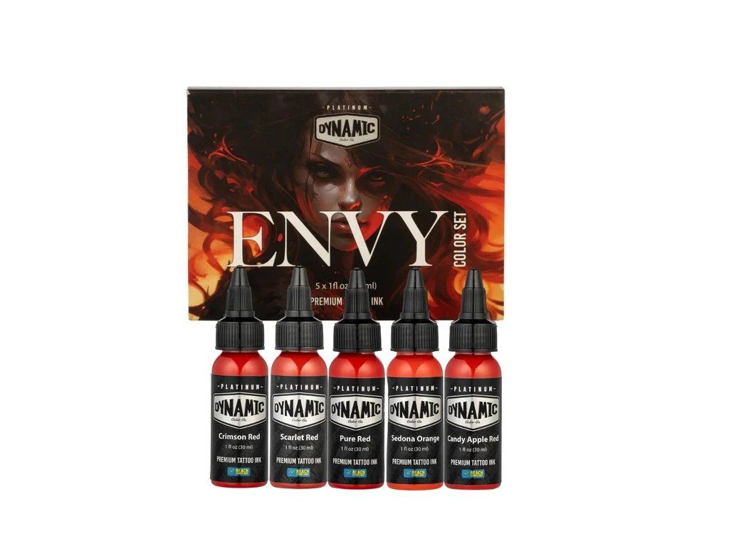 Das Envy by Dynamic Platinum-Set enthält fünf kräftige Rot- und Orangetöne – Karmesinrot, Scharlachrot, Reinrot, Sedona-Orange und Candy Apple – für satte, leidenschaftliche und energiegeladene Tattoos.