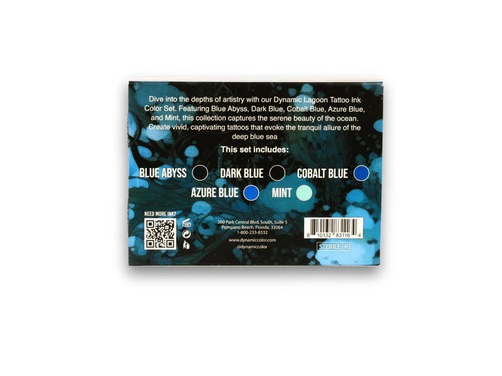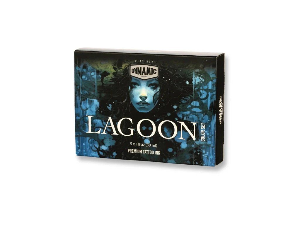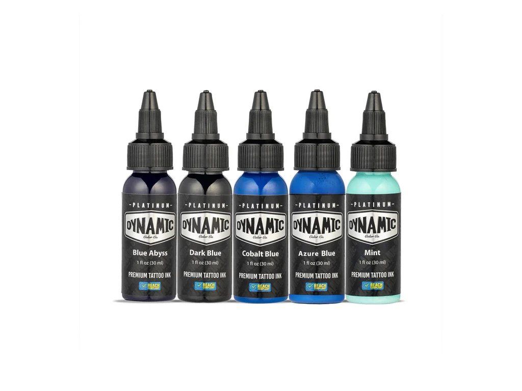 Das Lagoon-Set von Dynamic Platinum bietet fünf kräftige Blautöne: Blue Abyss, Dunkelblau, Kobaltblau, Azurblau und Mint – ideal für alle Tattoo-Stile, die die Tiefe, den Kontrast und die Frische des blauen Spektrums erfordern.