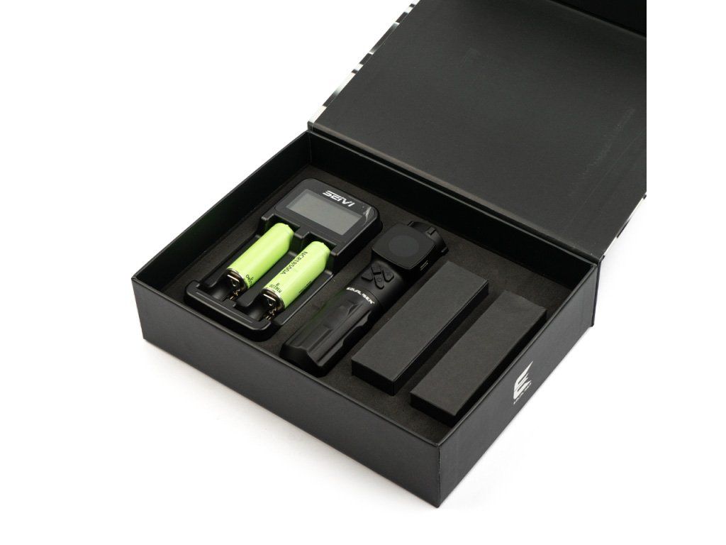 Lieferumfang: Tattoomaschine, Ladegerät, zwei Akkus und zwei USB-C-Kabel in verschiedenen Größen