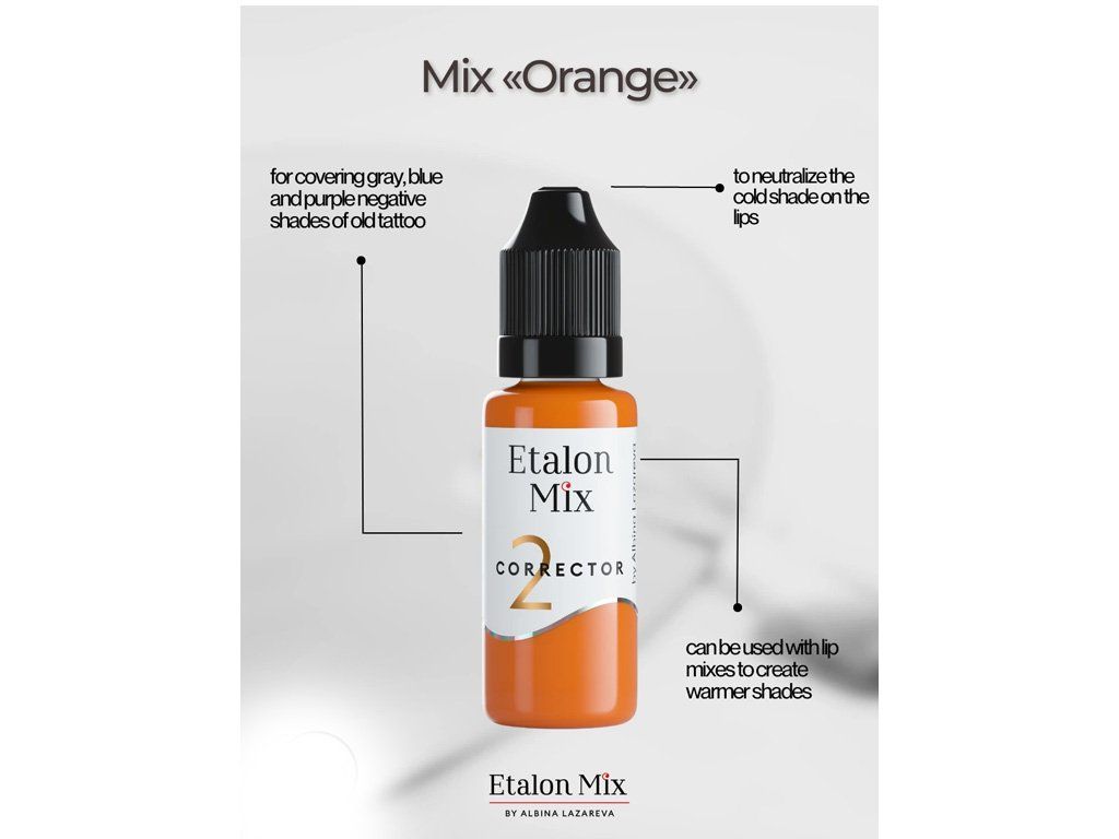 Mix „Orange“ – Korrektor zum Abdecken von Grau; Blauer und violetter unerwünschter Farbton von altem Permanent-Augenbrauen-Makeup. Kann in Lippenmischungen verwendet werden, um wärmere Farbtöne aus der Etalon Mix-Palette zu erzeugen.