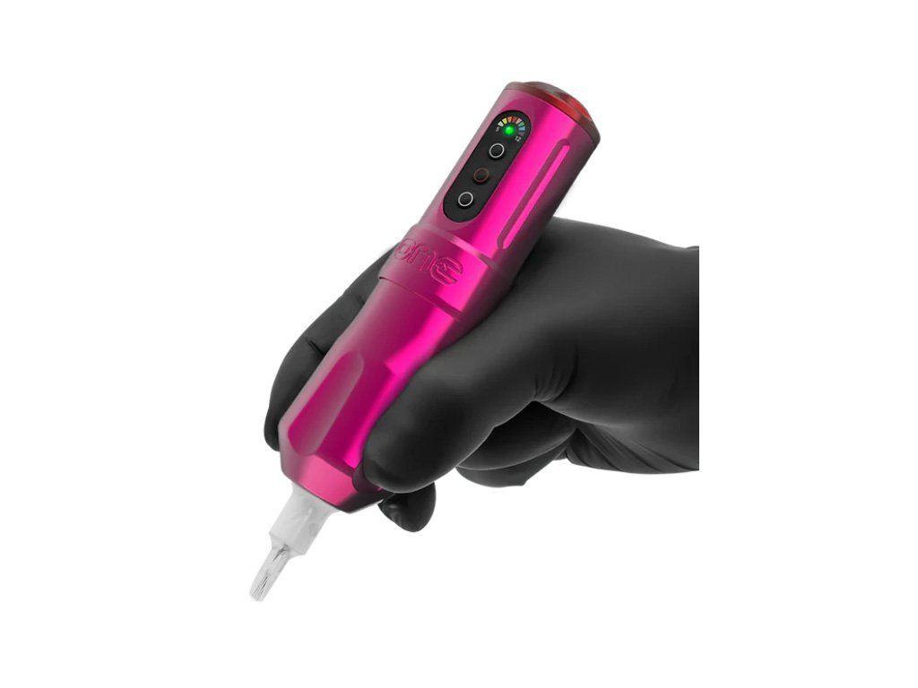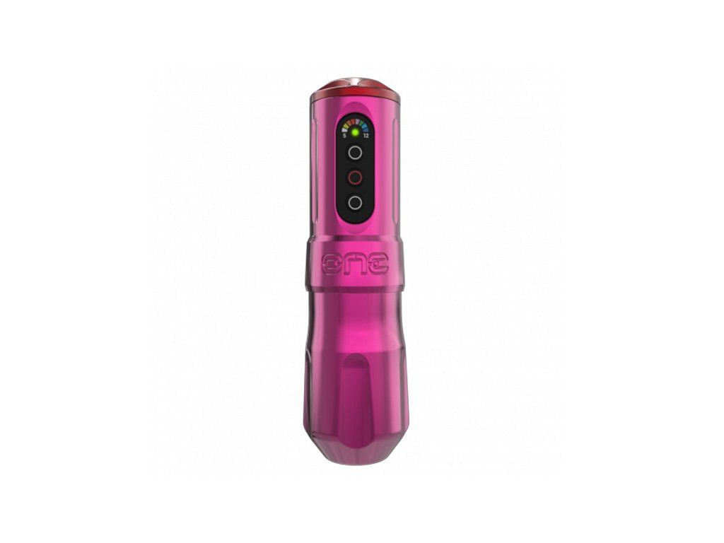 Diese Tätowiermaschine hat eine glänzende rosa Oberfläche. Es eignet sich zum Schattieren und realistischen Arbeiten.