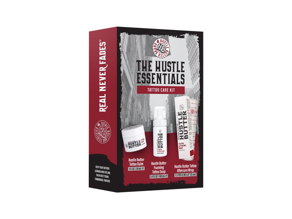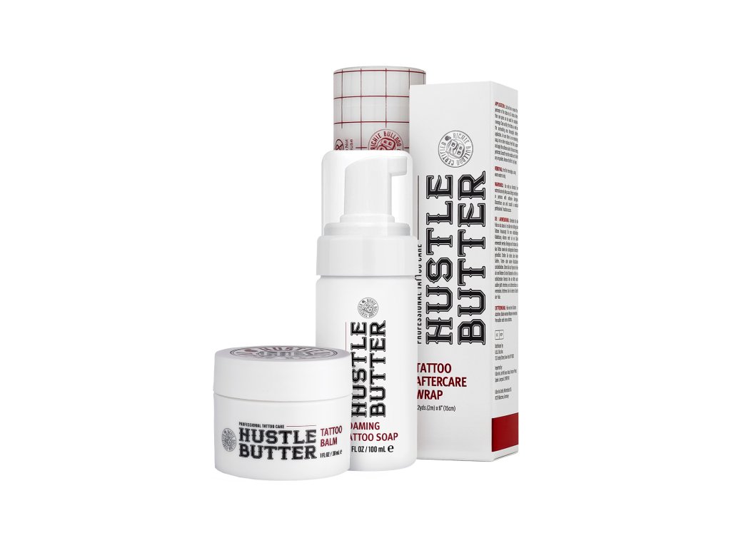 Das Hustle Butter Essentials Tattoo Care Kit bietet die ideale Lösung für die vollständige Pflege frischer Tattoos sowie für die langfristige Regeneration der Haut. Es kombiniert drei weltweit beliebte Studio-Produkte: Hustle Butter Deluxe 30 ml, Hustle Butter Foaming Tattoo Soap 100 ml und Hustle Butter Tattoo Aftercare Wrap 15 × 200 cm.