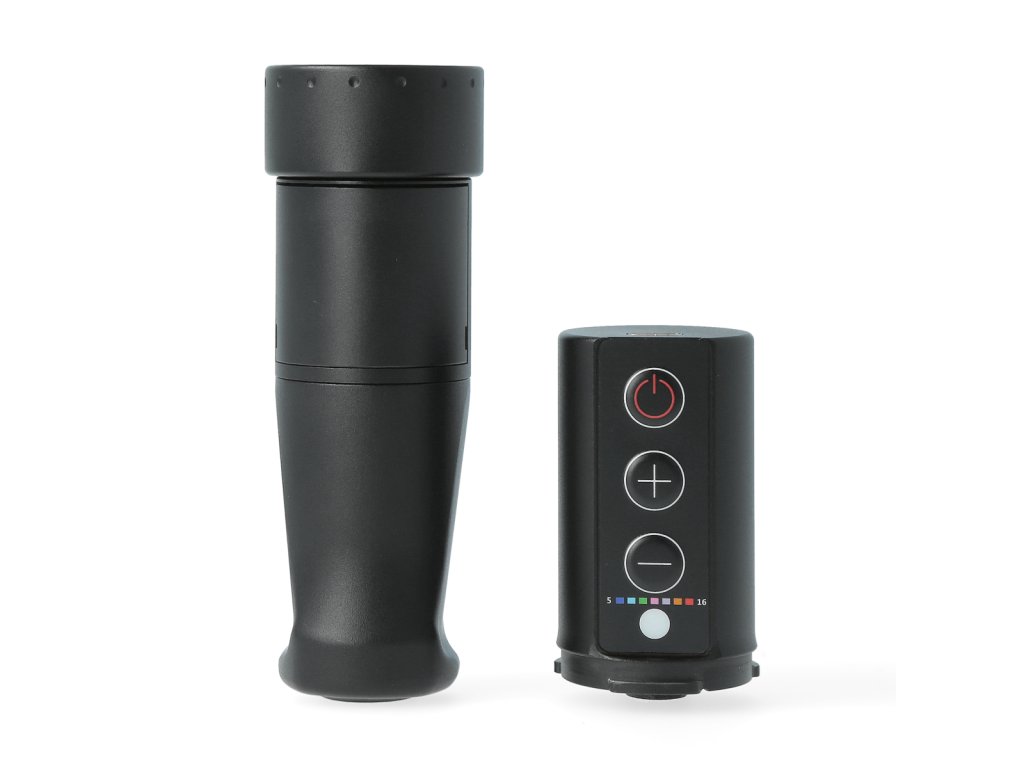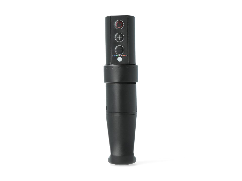 Die Maschine wird mit einem austauschbaren STREAM-Akku mit einem breiten Spannungs- und Frequenzbereich betrieben. Die Spannung wird direkt am Akku in 0,5-V-Schritten eingestellt, was eine präzise Anpassung der Leistung an den jeweiligen Arbeitsstil und die verwendeten Kartuschen ermöglicht. Die Injektionstiefe wird über einen Drehgriff mit stufenloser Verstellung reguliert. Der abnehmbare Aluminiumgriff ist vollständig autoklavierbar.