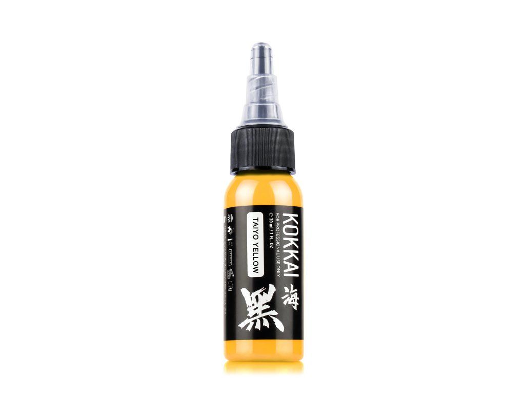 Taiyo Yellow Tattoofarbe von Kokkai Sumi Inks kombiniert traditionelle japanische Sumi-Farbenherstellungstechniken mit moderner Tattoo-Farbenproduktion und kreiert so ein leuchtendes, lebendiges Gelb. Inspiriert vom strahlenden Glanz der Sonne liefert diese Farbe kräftige, reine Gelbtöne mit außergewöhnlicher Konsistenz und gleichmäßiger Anwendung.