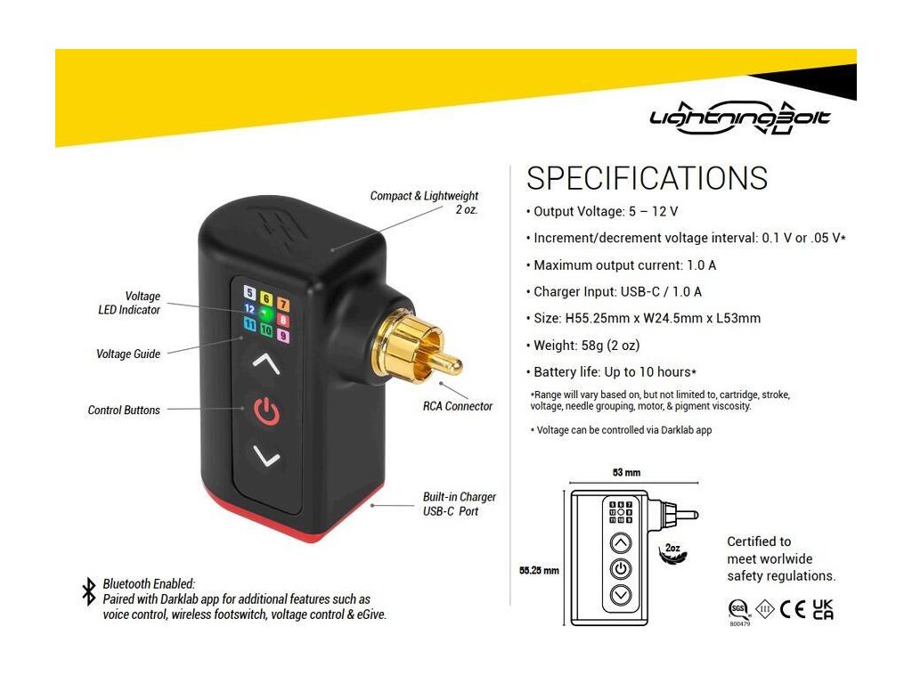 Netzteil von FK Irons – Akku für Tattoomaschinen mit Cinch-Anschluss. Eigenschaften: • 6–10 Stunden Akkulaufzeit mit einer einzigen Ladung. Betrieb auch mit angeschlossenem Ladegerät möglich. • Ausgangsspannung 6–12 V • Höhere Energiedichte für mehr Stabilität und Zuverlässigkeit • Dynamisches Energiemanagement: USB-C Li-Ion-Akku • Automatische Akkuabschaltung • Automatischer Schnellstart • Schnellladung mit 1,5 A • Extrem kompakte Größe, leicht zu transportieren • Kompatibel mit allen Tattoomaschinen mit RCA-Cinch-Anschluss • Integriertes Bluetooth. Funktioniert mit der Hover-/Mobil-App • Firmware-Update möglich • Energiesparmodus • Hardware-/Software-Reset • Unterstützung für kabellose Fußpedale (nicht im Lieferumfang enthalten) • Geringes Gewicht: 58 g Automatische Erkennung: • Überladeschutz (OVP) • Tiefentladeschutz (UVP) • Überstromschutz (OCC) • Tiefentladeschutz (OCD) • Verpolungsschutz (SCP) Celtic Supply ist der offizielle Distributor von FK IRONS / Darklab Produkten.