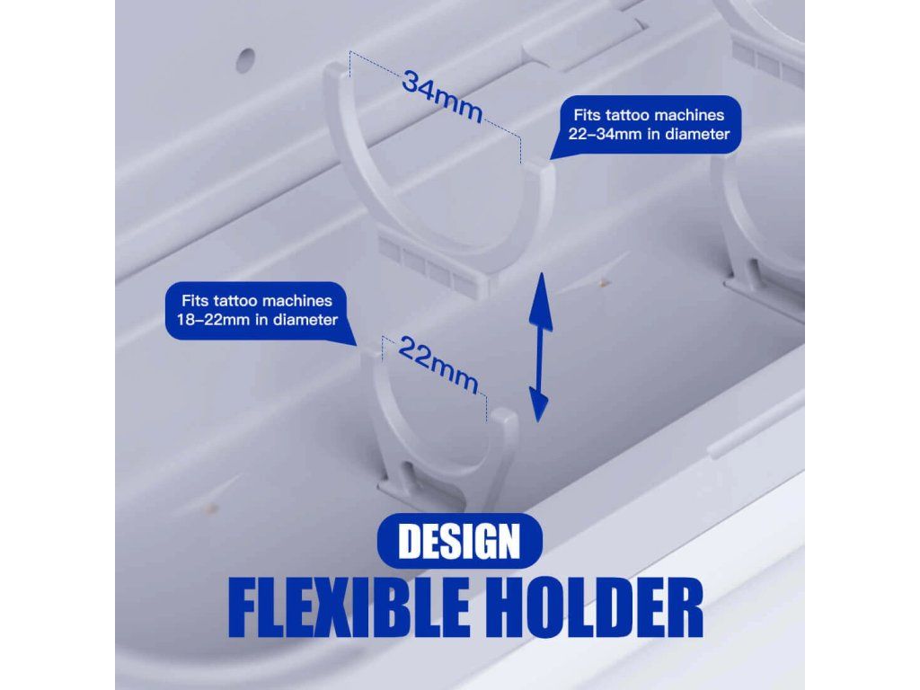 - Flexible Halterung: anpassbares Design für verschiedene Tattoo-Maschinengrößen (18-34mm Durchmesser).