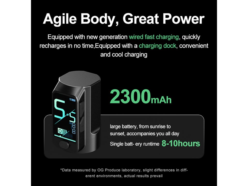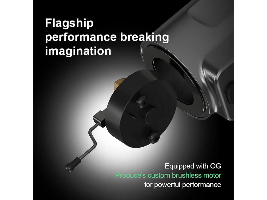Das große 1,47-Zoll-Farbdisplay zeigt Spannung, Geschwindigkeit und Betriebszeit an. Die Maschine bietet die Modi Soft und Hard für eine schnelle Anpassung des Arbeitsstils mit einem Doppelklick. Der Akku mit einer Kapazität von 2300 mAh bietet eine Laufzeit von bis zu 10 Stunden, abhängig von der Belastung.
