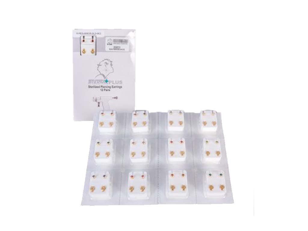 Studex Ohrstecker mit farbigem Kristall in vergoldeter Fassung. Erhältlich in einer Packung mit zwölf Paaren.