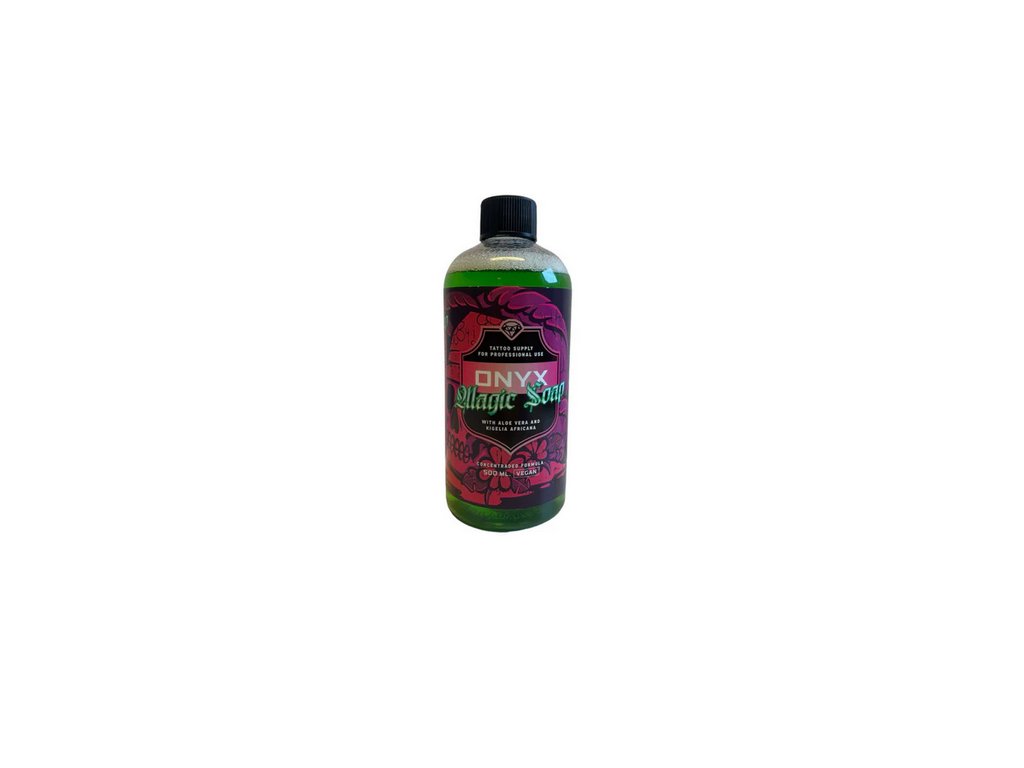 Onyx Magic Soap ist eine konzentrierte, grüne Seife, die speziell für die Anwendung in Tattoo-Studios entwickelt wurde. Sie dient der sanften und effektiven Reinigung der Haut während des gesamten Tätowierprozesses. Sie entfernt Tinte, Vaseline und Schmutzreste, ohne die Haut übermäßig zu belasten.