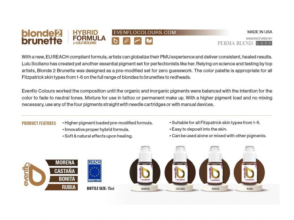 Blonde 2 Brunette von Evenflo ist das erste EU-ReACH-konforme Produkt der Marke und damit in der EU völlig legal. Das Team von Perma Blend hat hinter den Kulissen unermüdlich daran gearbeitet, das beste PMU-Pigment auf dem Markt zu entwickeln, damit Sie weiterhin fantastische Formulierungen erstellen und gleichzeitig die neuen EU-ReACH-Vorschriften einhalten können.
