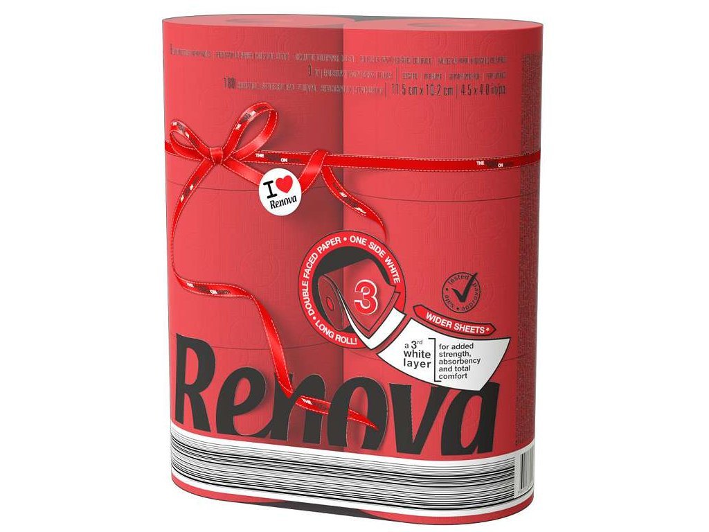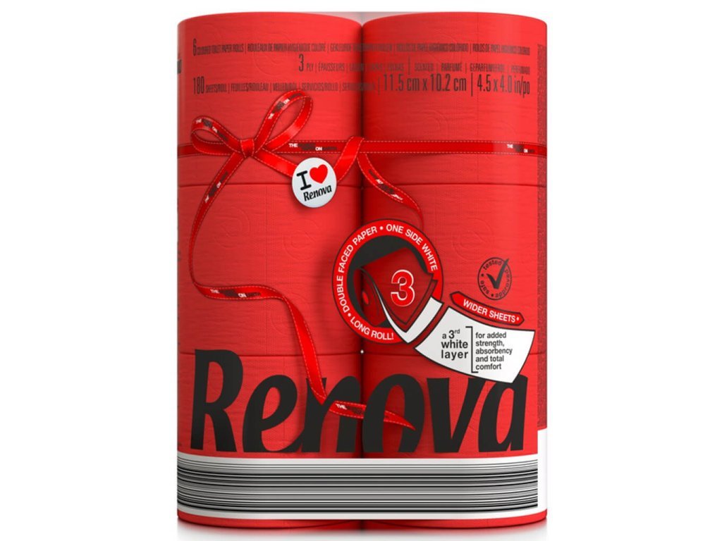 Das dreilagige, rote Toilettenpapier Renova Maxi bringt Originalität, Stil und Komfort in jedes Badezimmer. Es ist außergewöhnlich weich, reißfest und dezent parfümiert und sorgt so für ein angenehmes Gefühl bei jeder Benutzung. Hergestellt aus 100 % natürlicher Zellulose, ist es biologisch abbaubar und enthält keine hautreizenden Farbstoffe oder Duftstoffe. Dermatologisch und gynäkologisch getestet, verursacht es keine Hautreizungen und hinterlässt keine Verfärbungen.