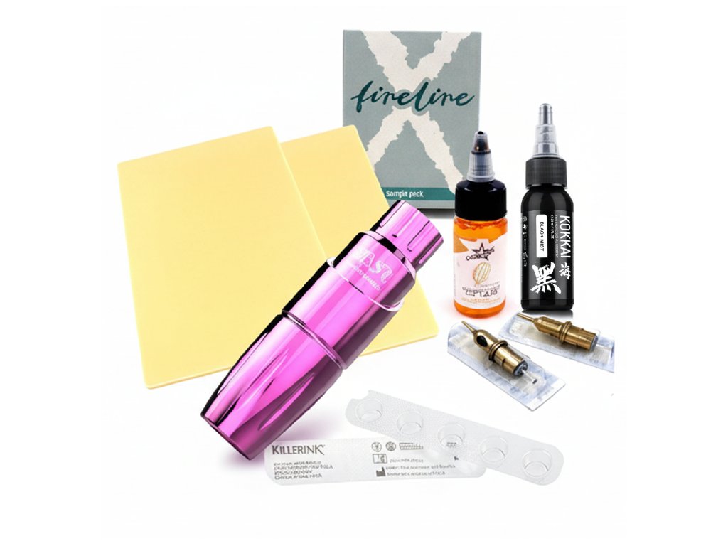 Komplettes Tattoo-Set für Anfänger im eleganten rosa Design. Kabelloser Dragonhawk Mast Tour Pen mit leistungsstarkem japanischem Motor (3,5 mm Hub, 5–11 V, 9000 U/min), sterile Farbbecher, hochwertige schwarze Kokkai Sumi-Tinte und extra dicke Übungshaut. Gratis-Bonus: 2x NAOM PMU-Nadeln 0801 RLLT und ein FINELINE-Probierpaket (0807RS, 0803RL, 1005RL) sowie Unistar Stachelbeerseife zur Hautvorbereitung. Alles, was du für deine ersten Tattoo-Versuche brauchst. Ideal für Anfänger, Tattoo-Schüler und Jugendliche unter Aufsicht der Eltern. Stilvolles rosa Design und kabellose Bewegungsfreiheit.