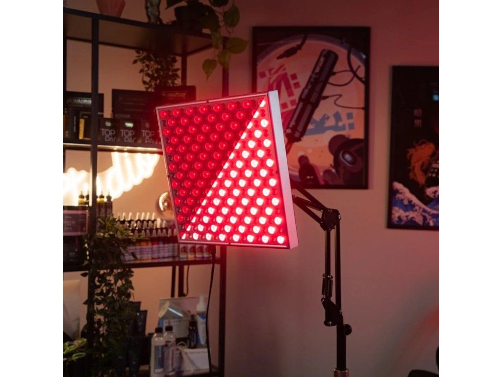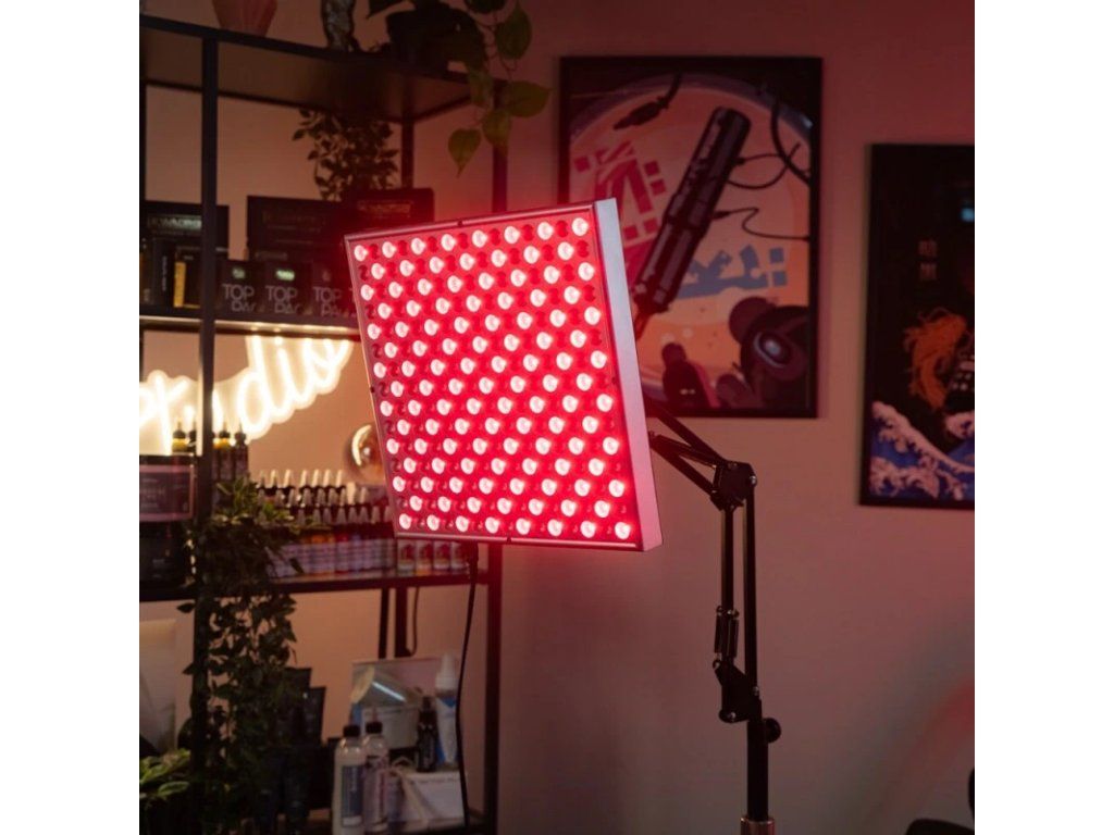 Die Lampe wird zur Unterstützung der Hautregeneration nach dem Tätowieren verwendet. Sie wird über den zu behandelnden Bereich positioniert, Höhe und Winkel des Panels werden eingestellt und sie wird in sicherem Abstand wirken gelassen. Geeignet für Studios und die Heimanwendung.