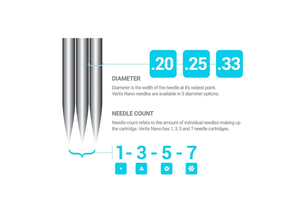 Die Vertix Nano-Kartuschen wurden von Experten entwickelt, wobei der Schwerpunkt auf der Qualität liegt, mit mustergruppierten Nadeln aus japanischem Chirurgenstahl. Jede Patrone durchläuft eine zweistufige Prüfung (automatisiert und manuell).