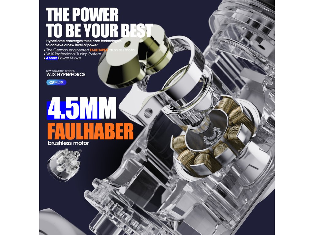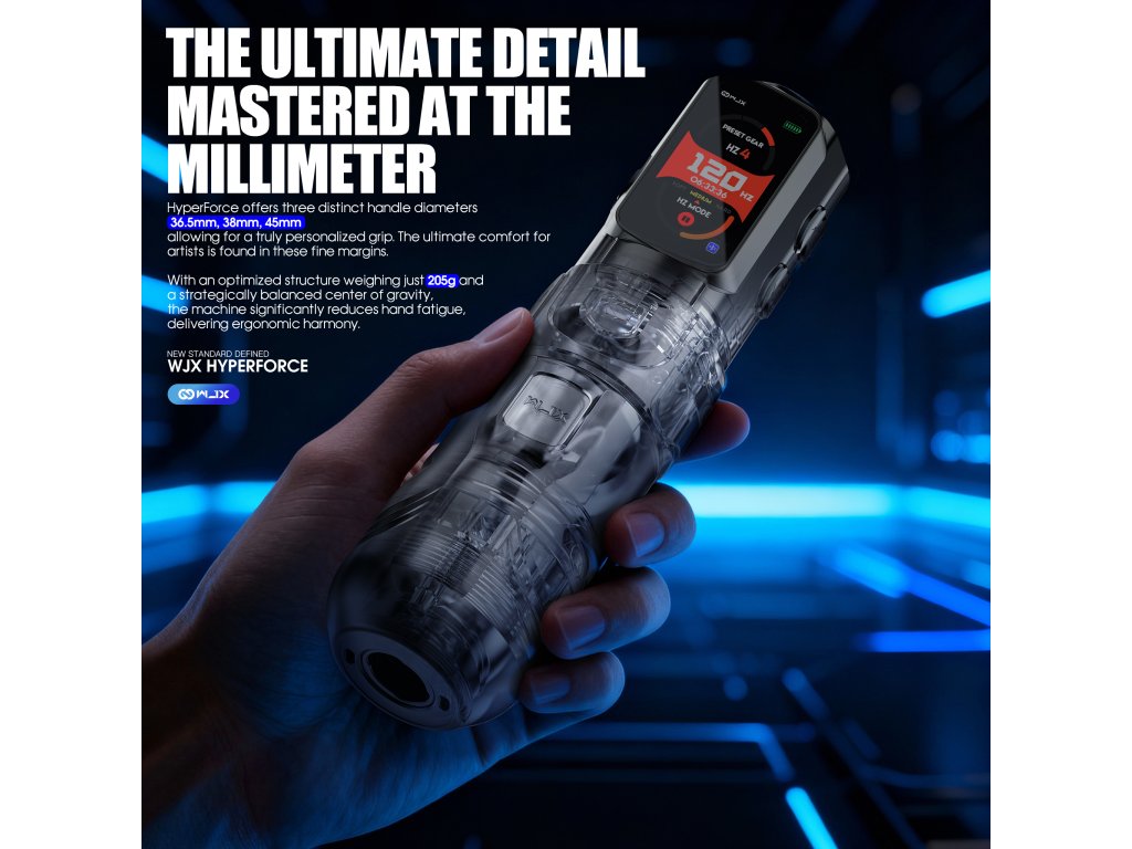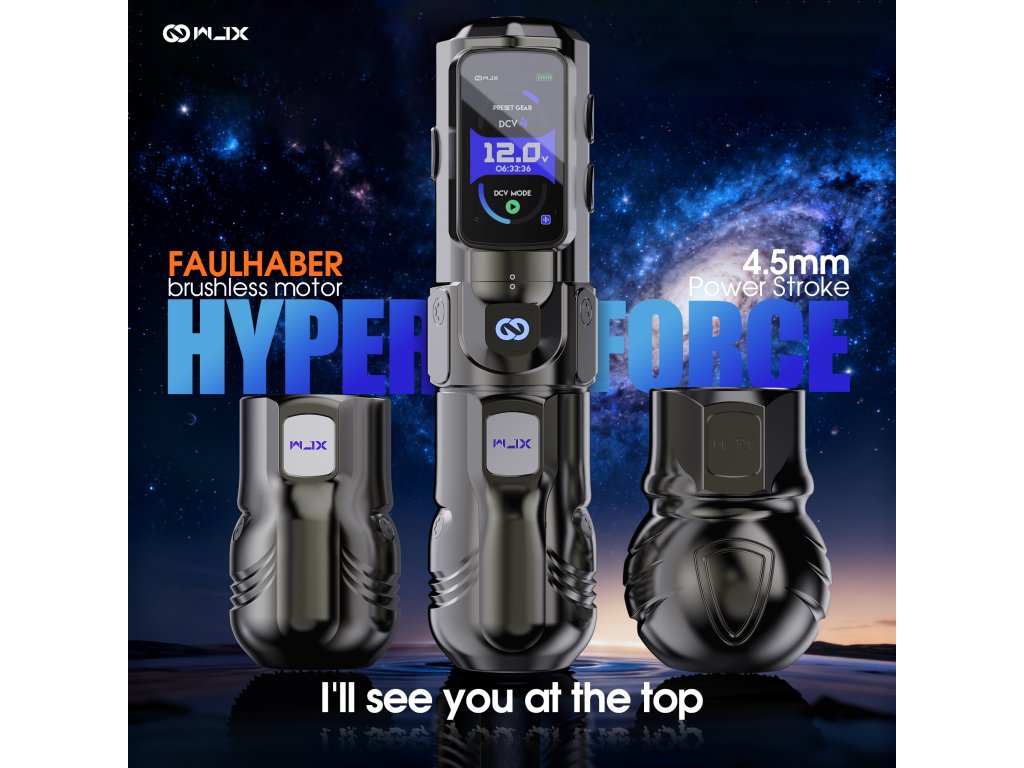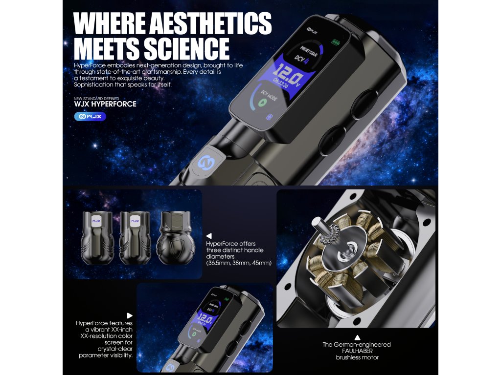 Die WJX HyperForce ist die neueste Generation der WJX-Maschinen und wurde exklusiv für den professionellen Einsatz in Tattoo-Studios entwickelt. Ihr Design basiert auf einem Direktantrieb, der eine verlustfreie und sofortige Kraftübertragung sowie einen sehr gleichmäßigen Betrieb in allen Arbeitsmodi gewährleistet. Das Herzstück der Maschine ist der in Deutschland gefertigte bürstenlose FAULHABER-Motor, der für seine hohe Effizienz, Drehzahlstabilität und lange Lebensdauer bekannt ist. Der feste Hub von 4,5 mm bietet ausreichend Kraft für satte Linien, schnelles Ausfüllen und Arbeiten mit höheren Geschwindigkeiten ohne Leistungsschwankungen. Die Maschine ist mit einem übersichtlichen Farbdisplay ausgestattet, das Spannung, Betriebsmodus, Akkustand und Betriebszeit anzeigt. Es unterstützt zwei Leistungsregelungsmodi, den Spannungs-DCV-Modus und den Frequenz-HZ-Modus, was eine präzise Anpassung des Maschinenverhaltens an eine bestimmte Arbeitstechnik ermöglicht.