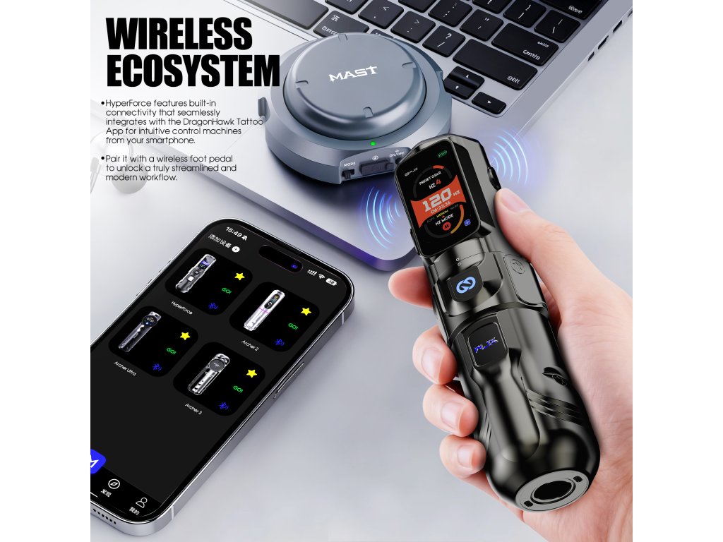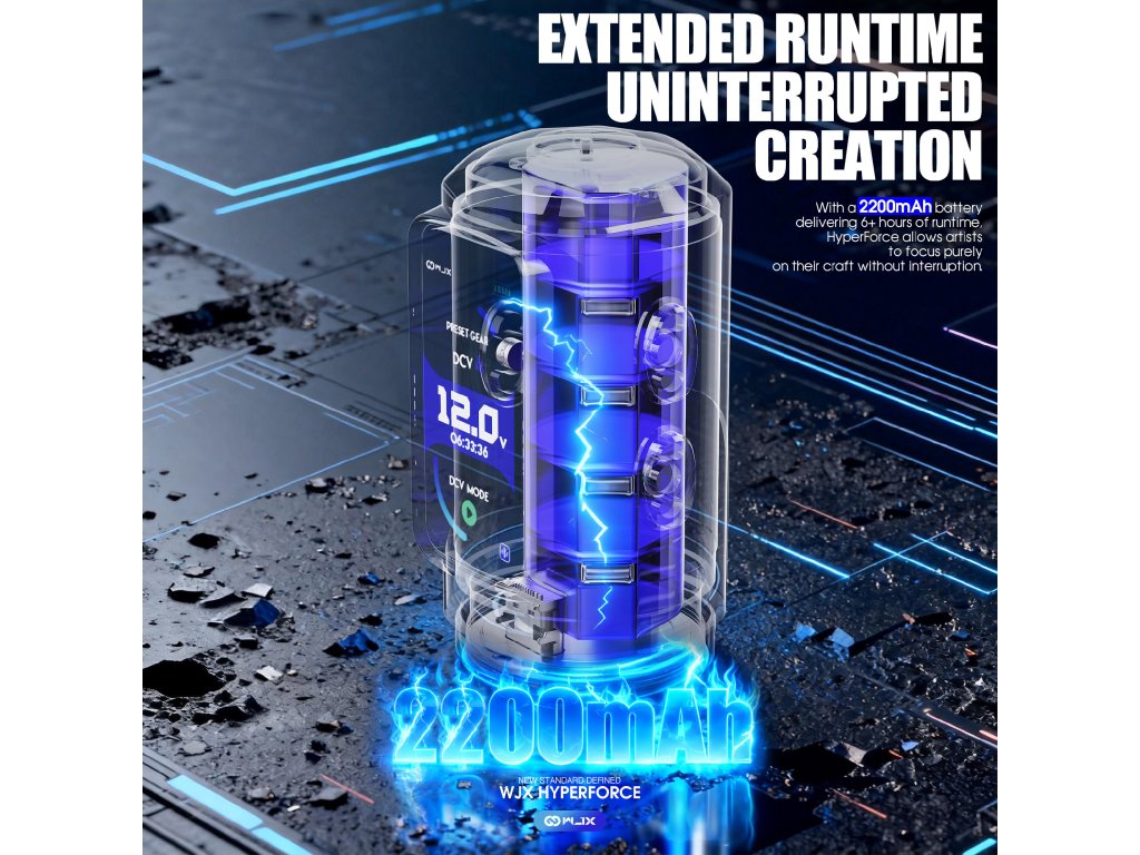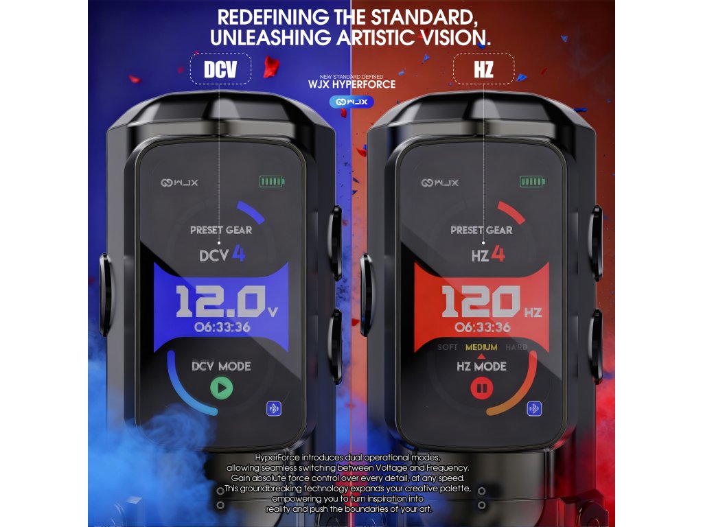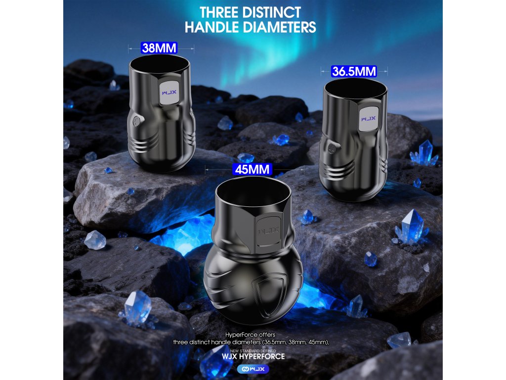 Die WJX HyperForce ist die neueste Generation der WJX-Maschinen und wurde exklusiv für den professionellen Einsatz in Tattoo-Studios entwickelt. Ihr Design basiert auf einem Direktantrieb, der eine verlustfreie und sofortige Kraftübertragung sowie einen sehr gleichmäßigen Betrieb in allen Arbeitsmodi gewährleistet. Das Herzstück der Maschine ist der in Deutschland gefertigte bürstenlose FAULHABER-Motor, der für seine hohe Effizienz, Drehzahlstabilität und lange Lebensdauer bekannt ist. Der feste Hub von 4,5 mm bietet ausreichend Kraft für satte Linien, schnelles Ausfüllen und Arbeiten mit höheren Geschwindigkeiten ohne Leistungsschwankungen. Die Maschine ist mit einem übersichtlichen Farbdisplay ausgestattet, das Spannung, Betriebsmodus, Akkustand und Betriebszeit anzeigt. Es unterstützt zwei Leistungsregelungsmodi, den Spannungs-DCV-Modus und den Frequenz-HZ-Modus, was eine präzise Anpassung des Maschinenverhaltens an eine bestimmte Arbeitstechnik ermöglicht.